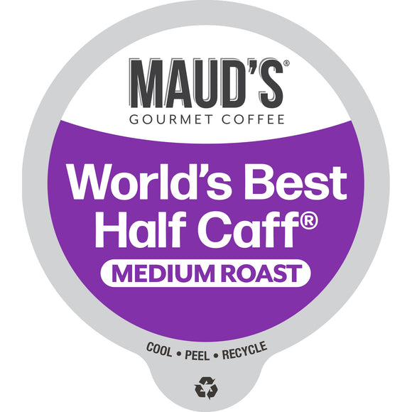 Maud's "World's Best Half-Caff" Half-Caffeinated Blend is a mixture of our delicious medium roast "Mellow Mood Decaf" and the rich, flavorful "Tall Dark & Handsome" dark roasted blend. Experience café-quality coffee at home, no matter how you enjoy it.
